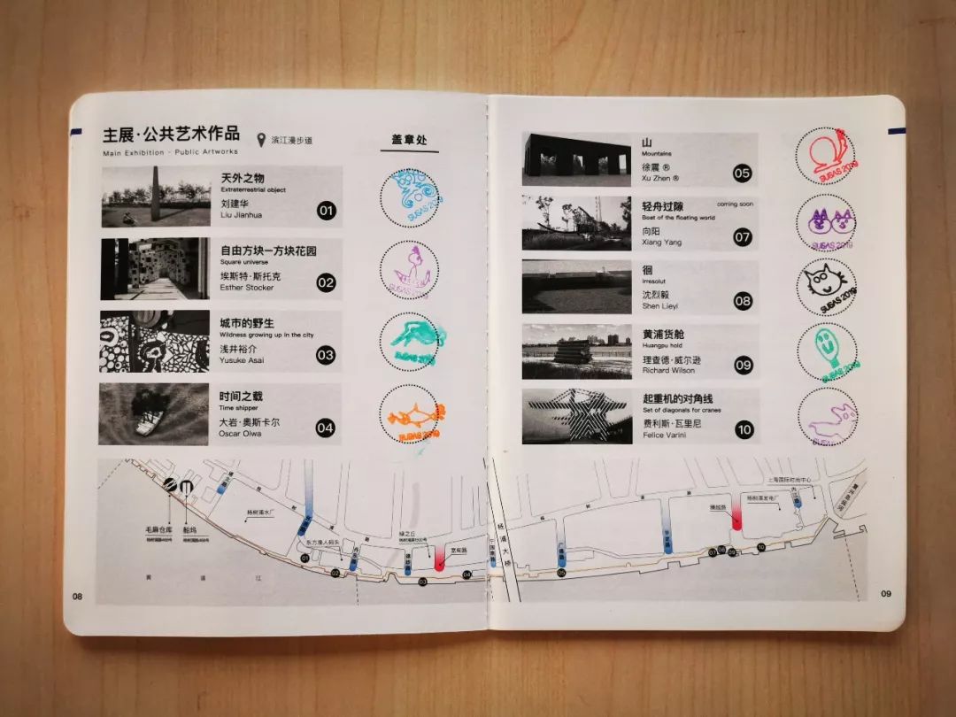 02/ 可根据护照里的地图所标识的杨浦滨江漫步道5.5公里沿线,找到每处参展公共艺术作品(目前有9处),作品信息牌上配有印章,自行在护照对应的作品旁盖章留念。(ps:户外印章每天坚守岗位(◉ω◉ )/,也请大家一定要好好爱护哦~)